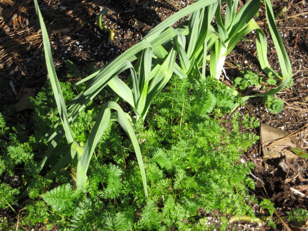 Since it’s come up I thought it’d be neat to show a little companion planting in action, here we have Elephant Garlic (Allium ampeloprasum var. ampeloprasum) growing with Danvers Red Core Carrots (Daucus carota subspecies sativus). These two garden plants get along because their growth habits do not compete despite both being primary root vegetables. Even the shape of the roots ensures they do not compete as garlic spreads at a certain depth while carrots dig downward in give or take a straight line. Garlic’s foliage is also roughly straight upwards with spread out leaves jutting out at odd angles. Carrots for a loose canopy which can discourage weed competition so they just work well near each other. Garlic in general is a good neighbor to a lot of other plant species as are carrots because they are pretty space-efficient. This leads into the fact that a lot of companion planting is about matching up growth habits and mature plant shapes so your crops can grow in physical and biological harmony. But companion planting is a topic for another post.